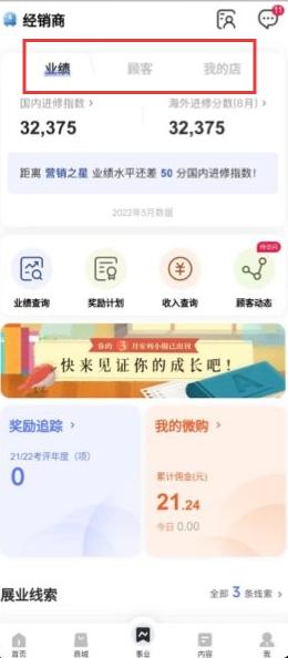 2、点击底部我的导航栏,即可查看国内进修指数、海外进修指数、业绩查询、奖励计划等数据及功能,了解经销业务情况。