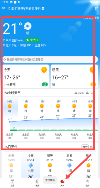 3、随记万年历APP天气页面,呈现当前天气状况、温度、风力等,还提供24小时及15日天气趋势。
