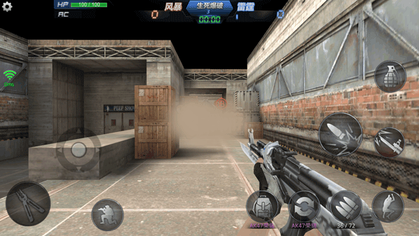 游戏画面左下角有一个圆圈状的虚拟按钮,右下角有个未显示的虚拟按钮,玩家通过滑动虚拟按钮控制人物的动作。其中左下角的虚拟按钮控制移动右下角的虚拟按 钮控制准星和射击。同时,在画面左上角设置按钮中有战绩查询、游戏设置、键位设置功能,左下角有蹲下按钮,画面右侧分布有跳跃、切换武器、换子弹、扔手雷 等按钮。