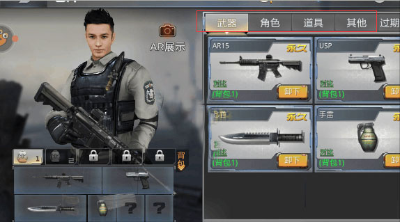 第一步:点击【仓库】进入到仓库界面,你在界面上将会看到武器、角色、道具、其他、过期道具五个栏目。