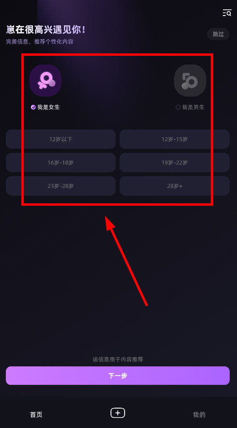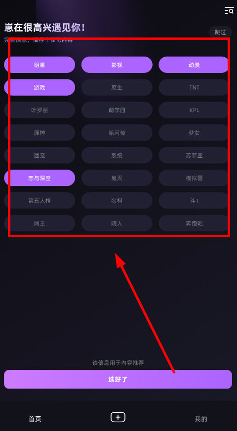 1、完成登录后选择自己的偏好标签和年龄段设置;