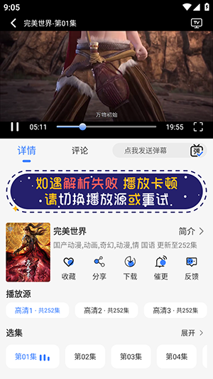 支持实时切换清晰度(标清/高清/超清)、1.0~2.0倍速播放、画面比例调节(16:9/4:3/全屏),观影节奏由你掌控。