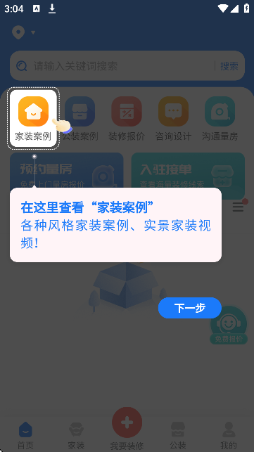 3、进入到软件首页,如图所示。点击【家装案例】有各种风格家装案例、实景家装视频!