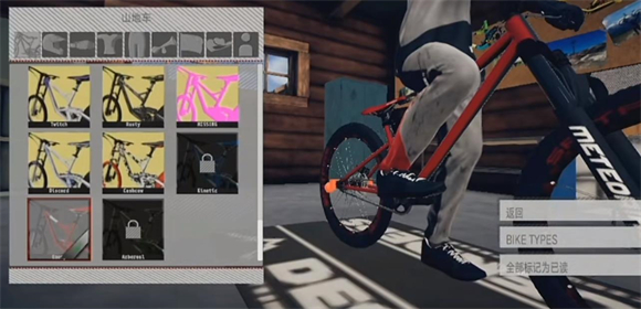 2、如何更换皮肤,在主界面点击车棚,然后向下滑动选择不同的山地车,然后点击想要的皮肤就可以更换了,其他装备的皮肤也是一样,点击两次就可以更换。