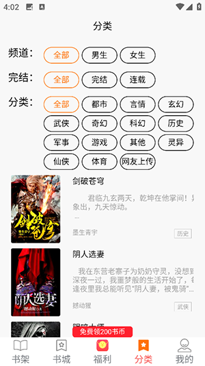 3、点击分类板块,可以按照自己的喜好筛选感兴趣的小说。